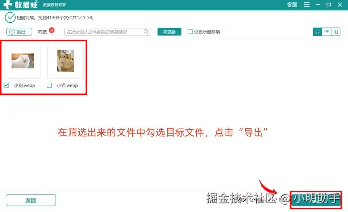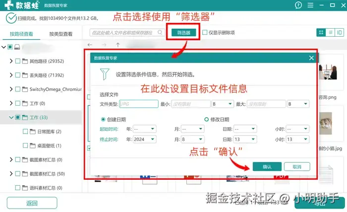 步骤2: 在扫描完成后,用户就能自由选择需要恢复的文件啦!扫描的文件如果很多,选择使用“筛选器”,在里面设置目标文件的相关信息,点击“确认”软件就能开启筛选模式了; 筛选后勾选目标文件,点击“导出”,在“浏览文件夹”中选择文件的存放位置,点击“确定”。