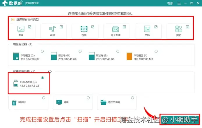 步骤1: 在电脑打开软件后,新用户在注册页面点击“免费试用”即可进入扫描准备页面;在该页面中设置目标数据类型 (可直接在左上角点击选择全部文件类型) ,在设置需要扫描的U盘,点击“扫描”按钮启动;