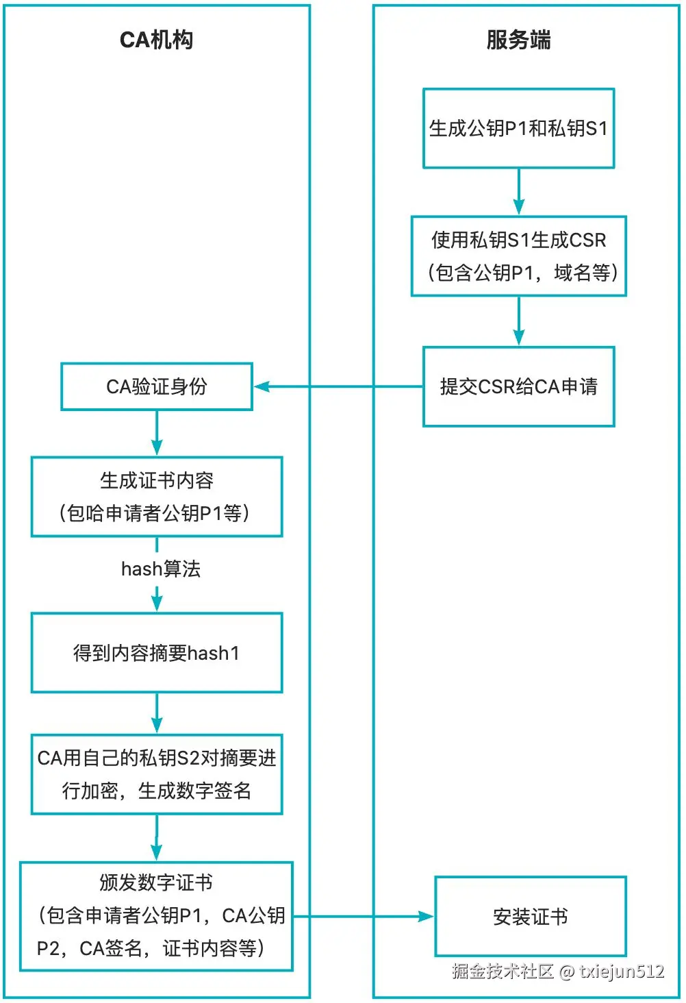 CA 验证身份并签发证书:CA 验证请求信息后,签发证书(包含公钥和 CA 签名)。