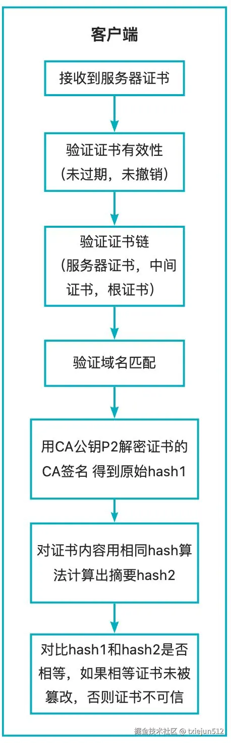 - 验证证书合法性: 客户端通过对比摘要判断是否合法。
