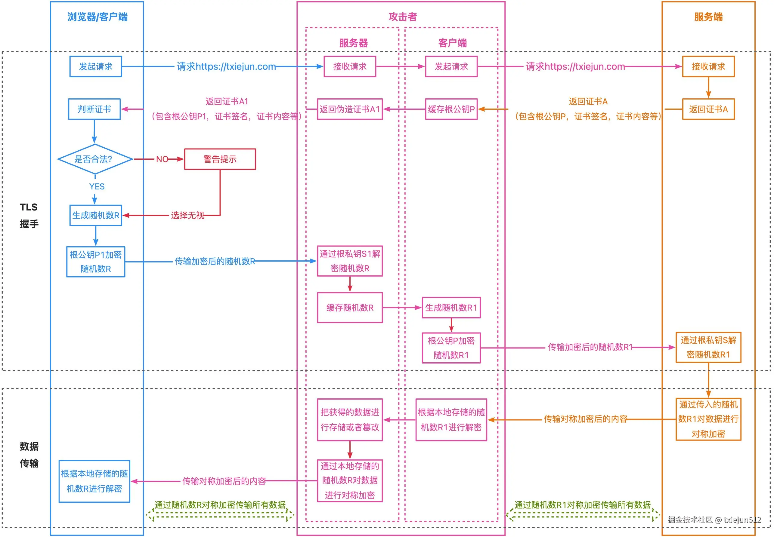 3、让客户端与攻击者做密钥交换(而非与真实服务器),从而解密并重建会话