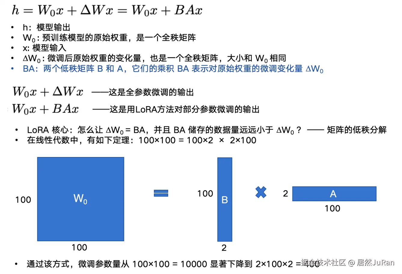 - LoRA 开山论文:2021 年 Microsoft Research 提出,首次提出了通过低秩矩阵分解的方式来进行部分参数微调,极大推动了 AI 技术在多行业的广泛落地应用:LoRA: Low-Rank Adaptation of Large Language Models