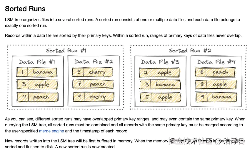 Sorted Runs 是 LSM Tree(Log-Structured Merge-Tree)结构中的一个重要概念,用于组织和管理存储在磁盘上的数据文件。Sorted Run 是一个包含若干主键有序且无重叠的文件集合。