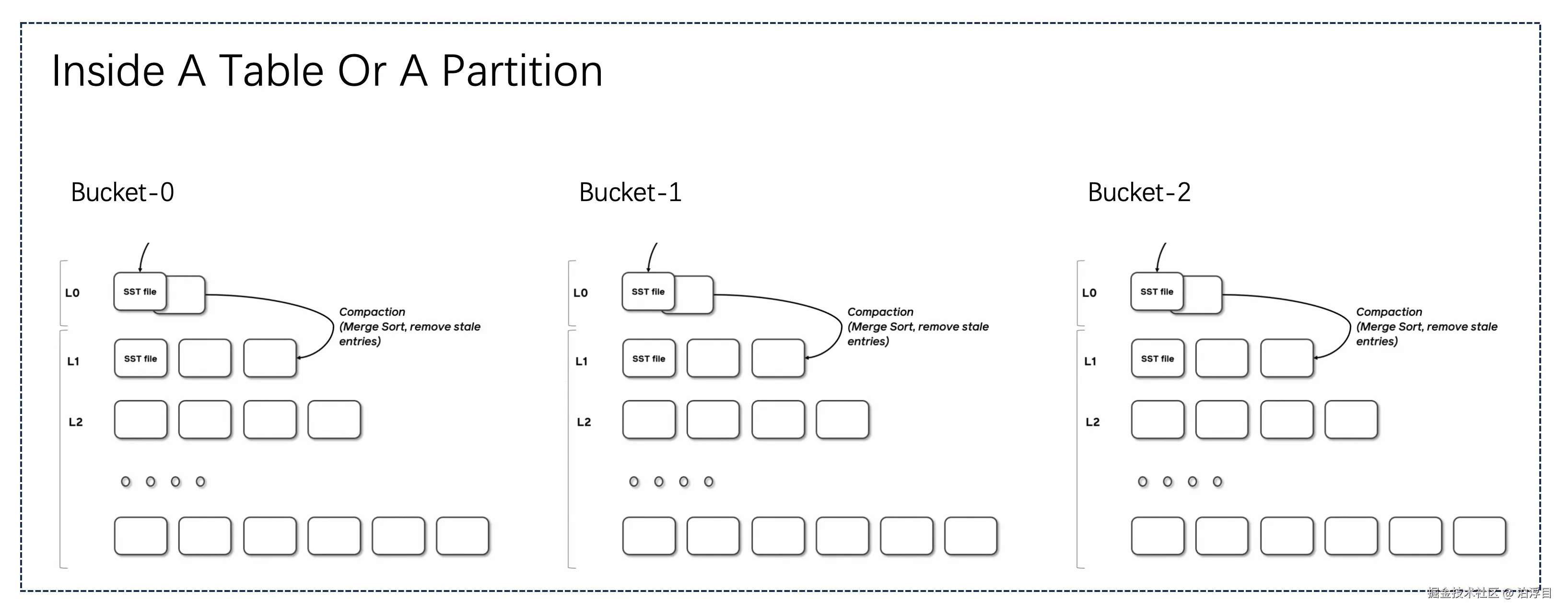 Compaction 策略会将低层级的多个 Sorted Run 合并到更高级别,形成更大的有序文件。