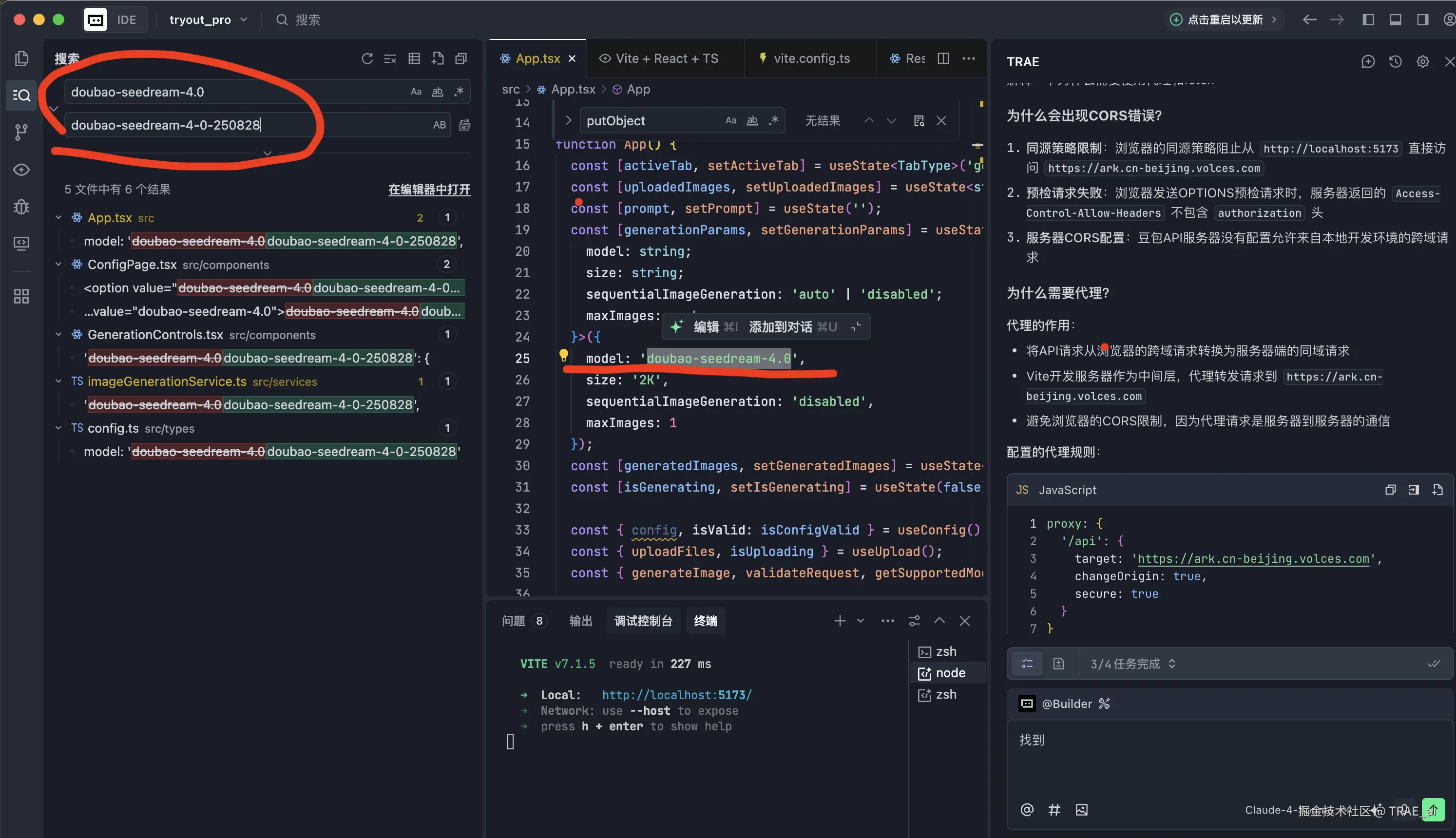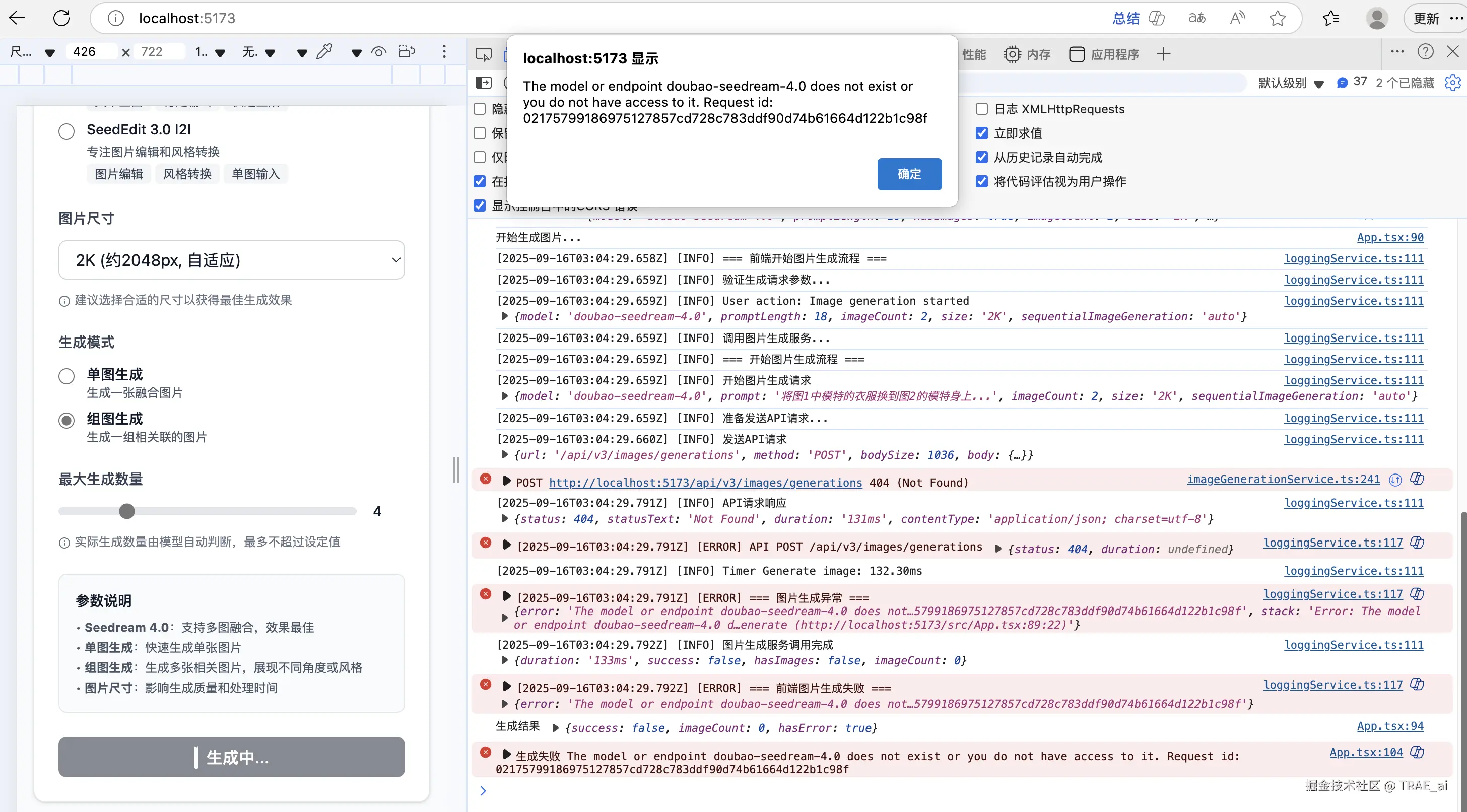查看代码,这个错是因为代码中的模型是 :doubao-Seedream-4.0 ,而正确的应该是:doubao-Seedream-4-0-250828。因此在 TRAE 中做一个替换即可。