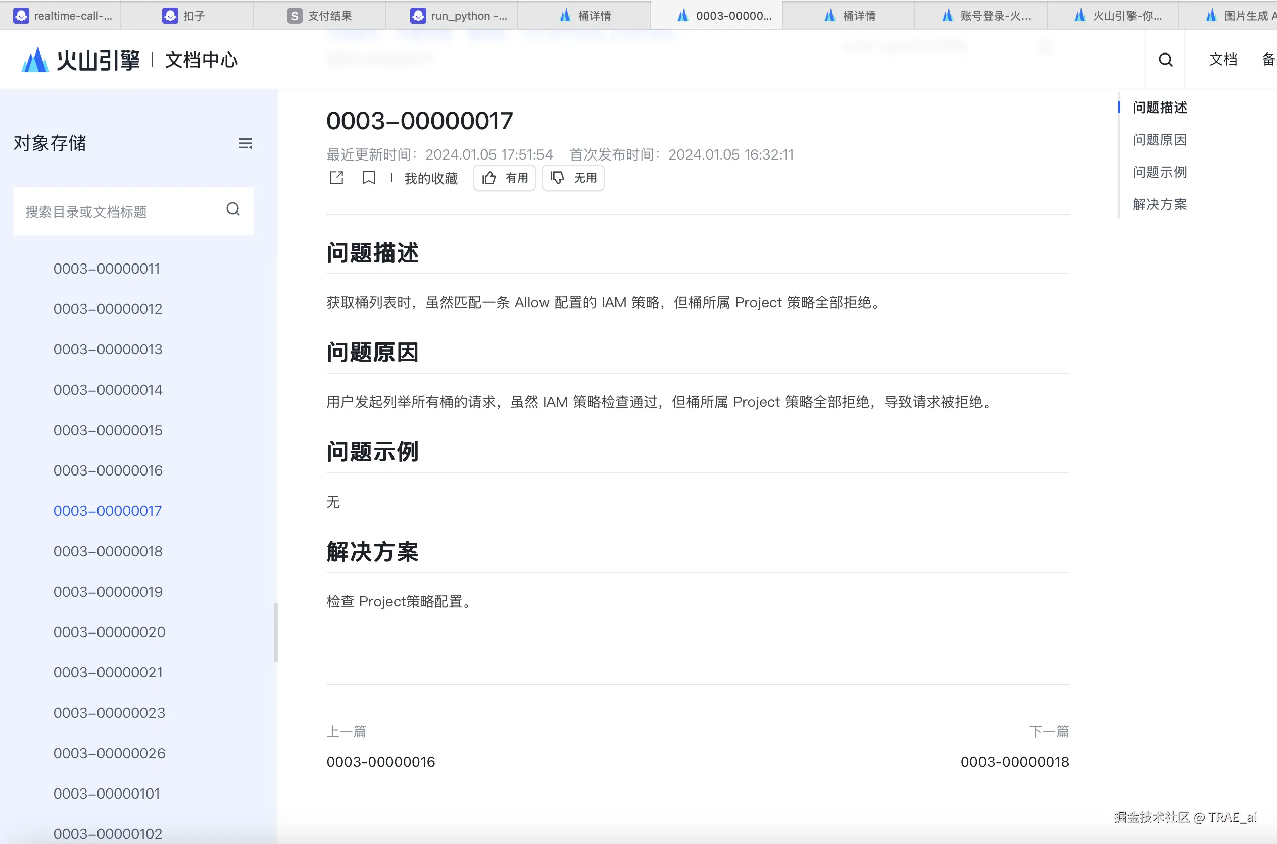 找到火山引擎对应错误说明。用户发起列举所有桶的请求,虽然 IAM 策略检查通过,但桶所属 Project 策略全部拒绝,导致请求被拒绝。