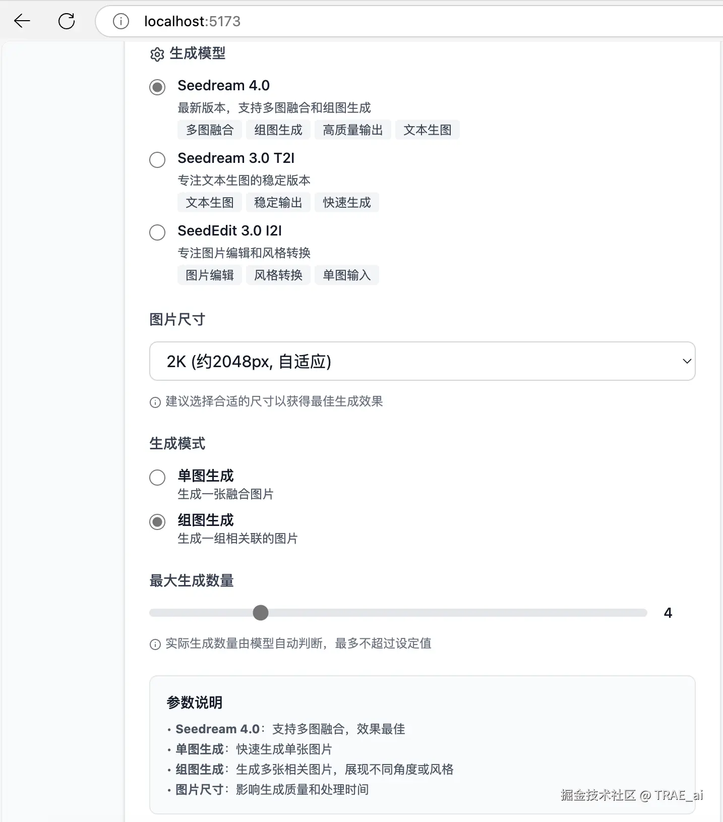 基于豆包 Seedream API 开发的文生图应用,支持用户输入文本描述生成高质量图像。应用支持多种图像尺寸、批量生成、流式响应等功能。