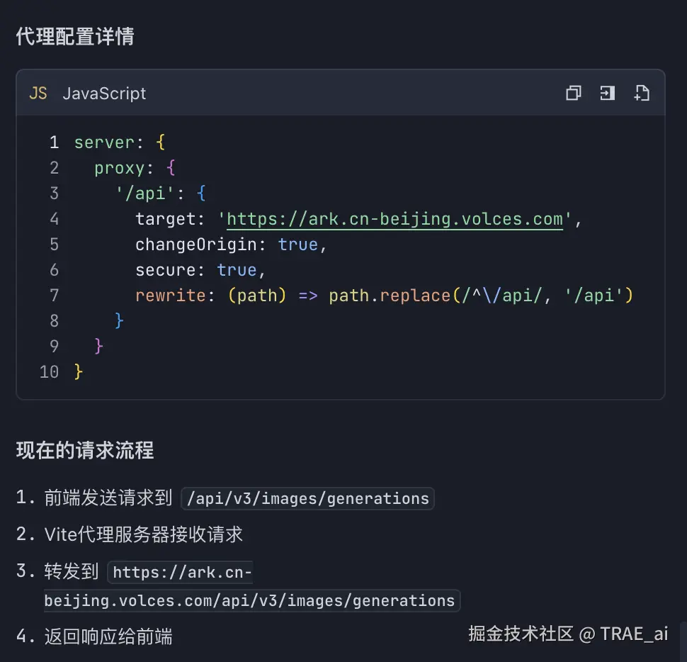 - Vite开发服务器作为中间层,代理转发请求到 https://ark.cn-beijing.volces.com