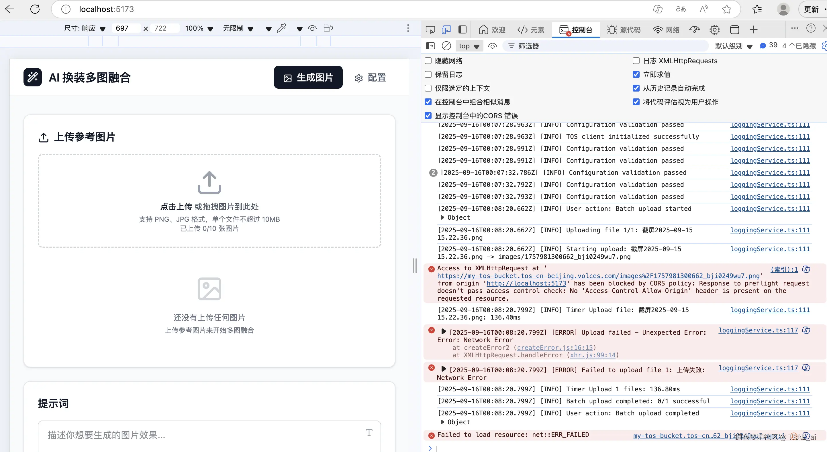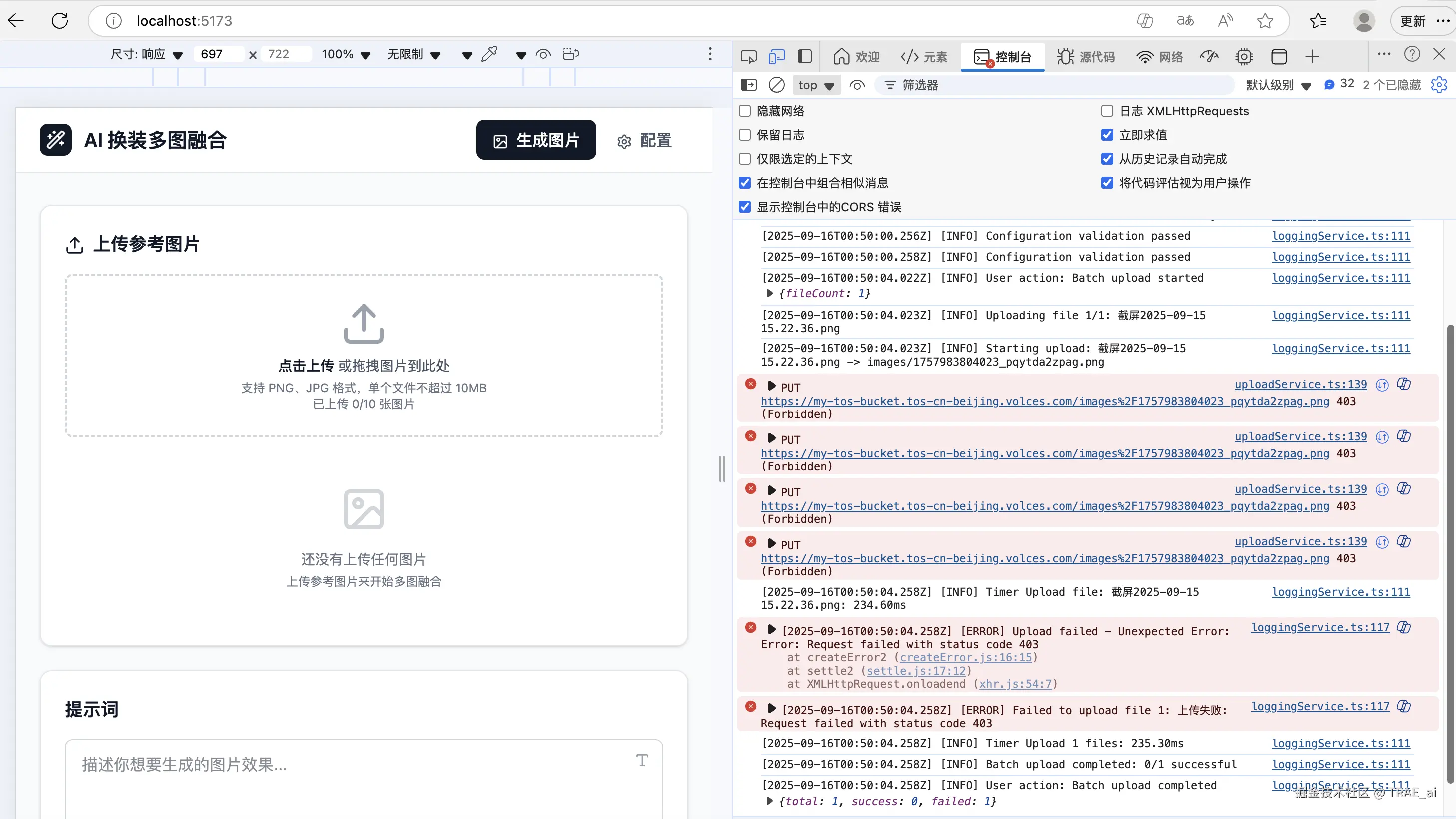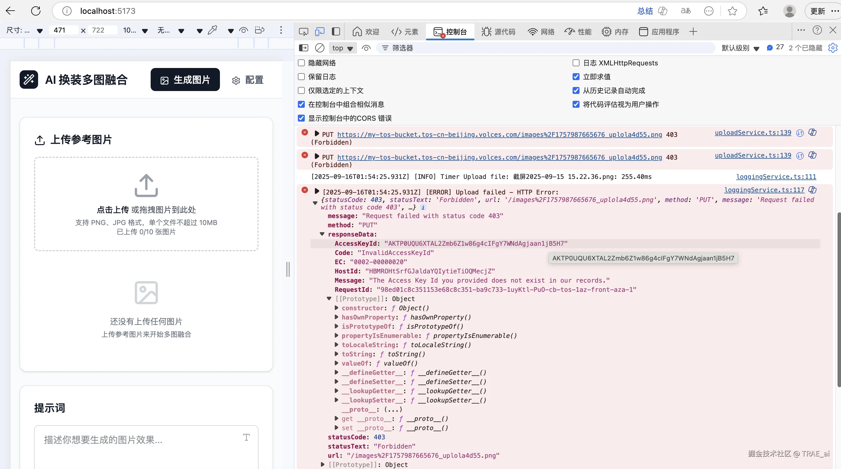 点击上传参考图片出错,打开浏览器控制台,可以看到错误: 对象存储客户端初始化问题。
