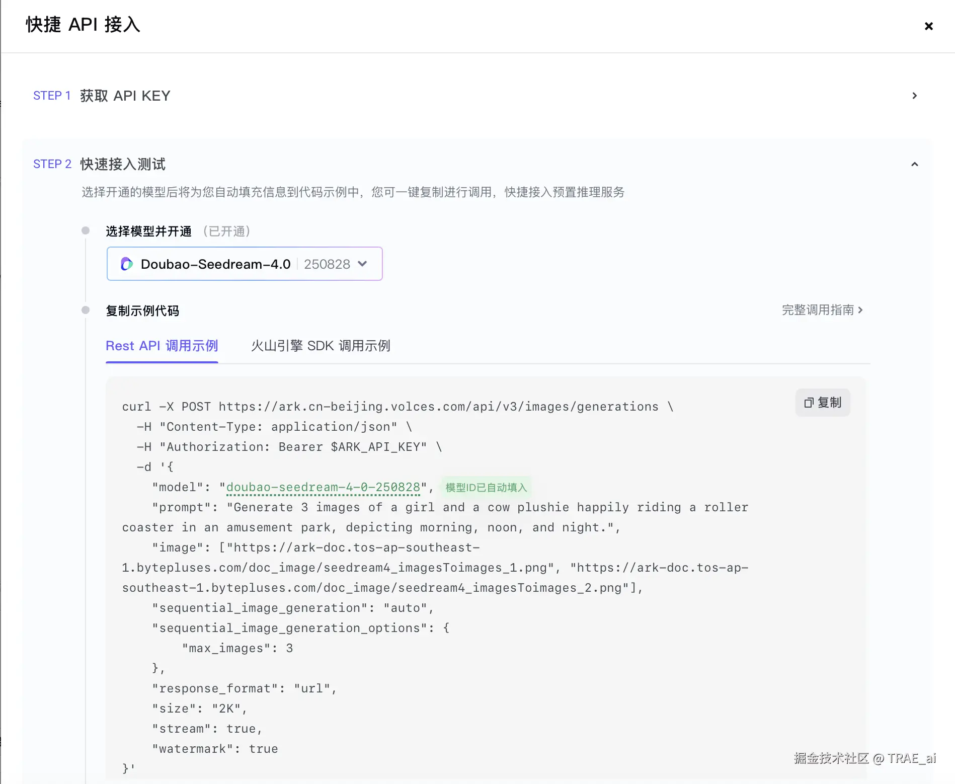 基于豆包 Seedream 4.0 API 的核心能力,我们可以实现多种图像生成模式。API 的基本调用格式如下: