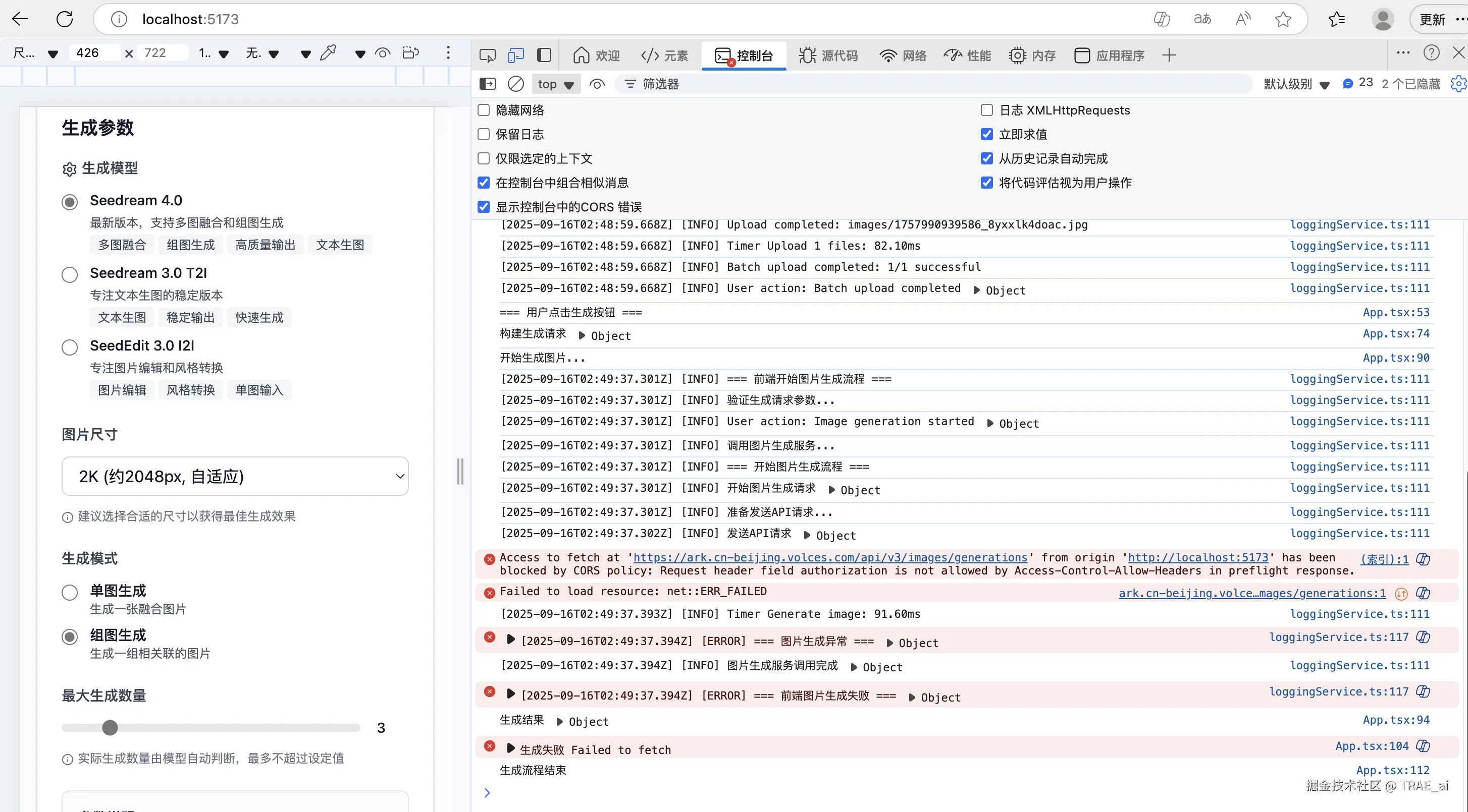 Access to fetch at 'https://ark.cn-beijing.volces.com/api/v3/images/generations' from origin 'http://localhost:5173' has been blocked by CORS policy: Request header field authorization is not allowed by Access-Control-Allow-Headers in preflight response.