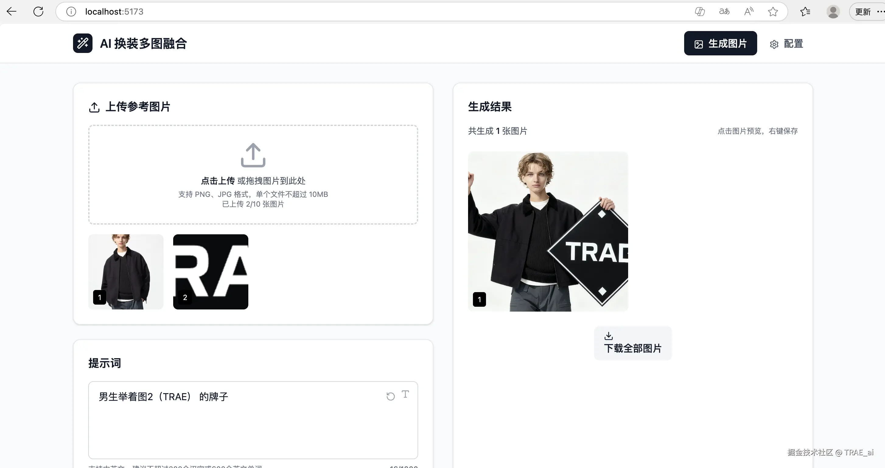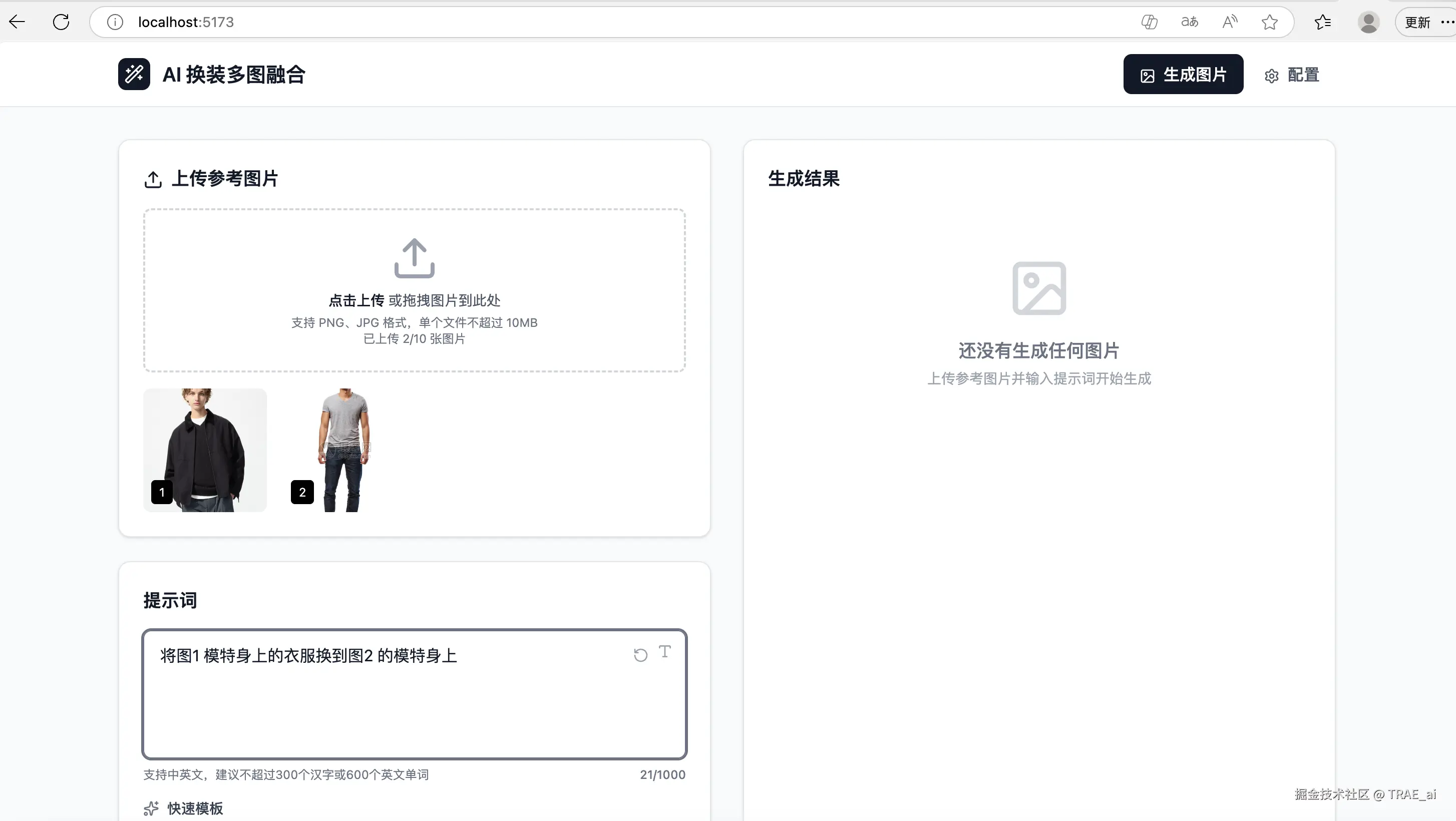 你需要生成一个UI界面,用户可以输入几张图片,提示词,然后你调用接口,生成一些或者一张图片。