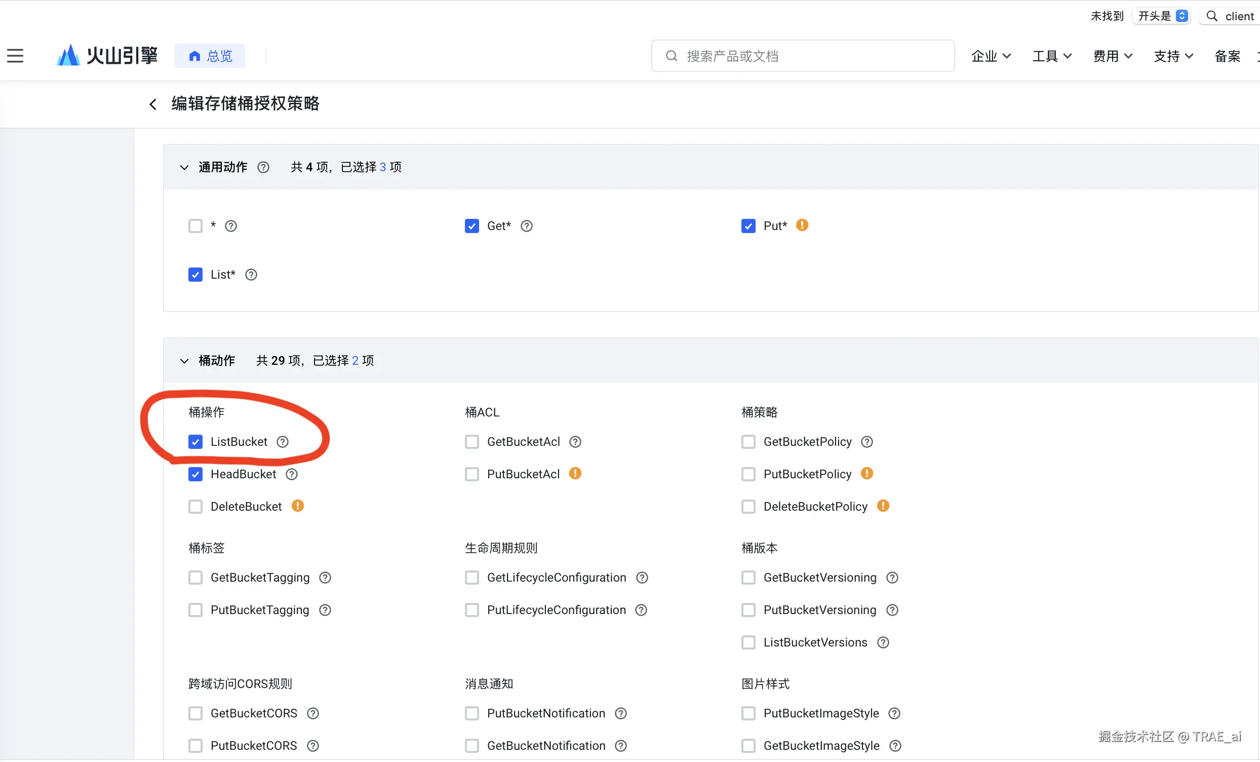 在火山引擎中增加列举权限。(具体权限配置需要参考火山引擎文档,这里不做详细介绍,小伙伴们看 www.volcengine.com/docs/6349/7…