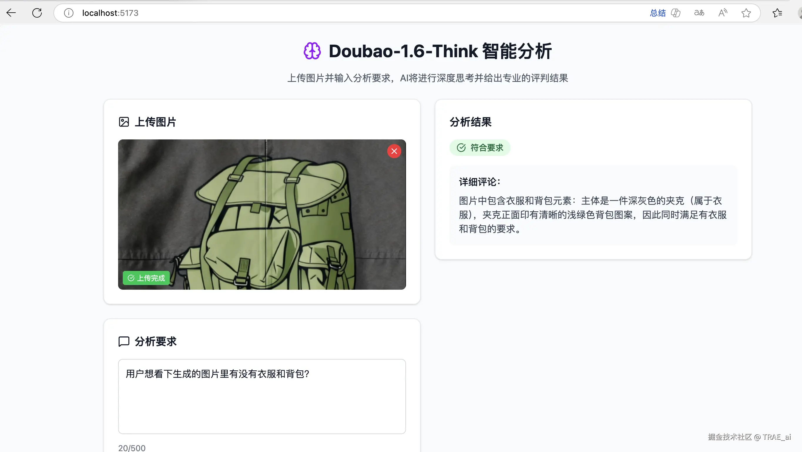 为了提升应用的智能化水平,我们集成了 Doubao-1.6-think 模型来分析多图融合生成的结果。这个功能可以自动评估生成图像的质量,判断是否符合用户的预期要求,为用户提供更加智能的体验。