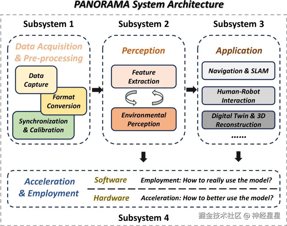 在此背景下,香港科技大学联合索非亚大学 INSAIT 研究所、上海交通大学等国内外高校和机构,结合学术界与产业界的洞察,提出了一种面向具身人工智能时代的理想全景系统架构——PANORAMA,并深入探讨了全景视觉与具身人工智能交叉领域中的新兴趋势及其跨学科影响,并展望了未来的发展路线图与亟待解决的开放性挑战。