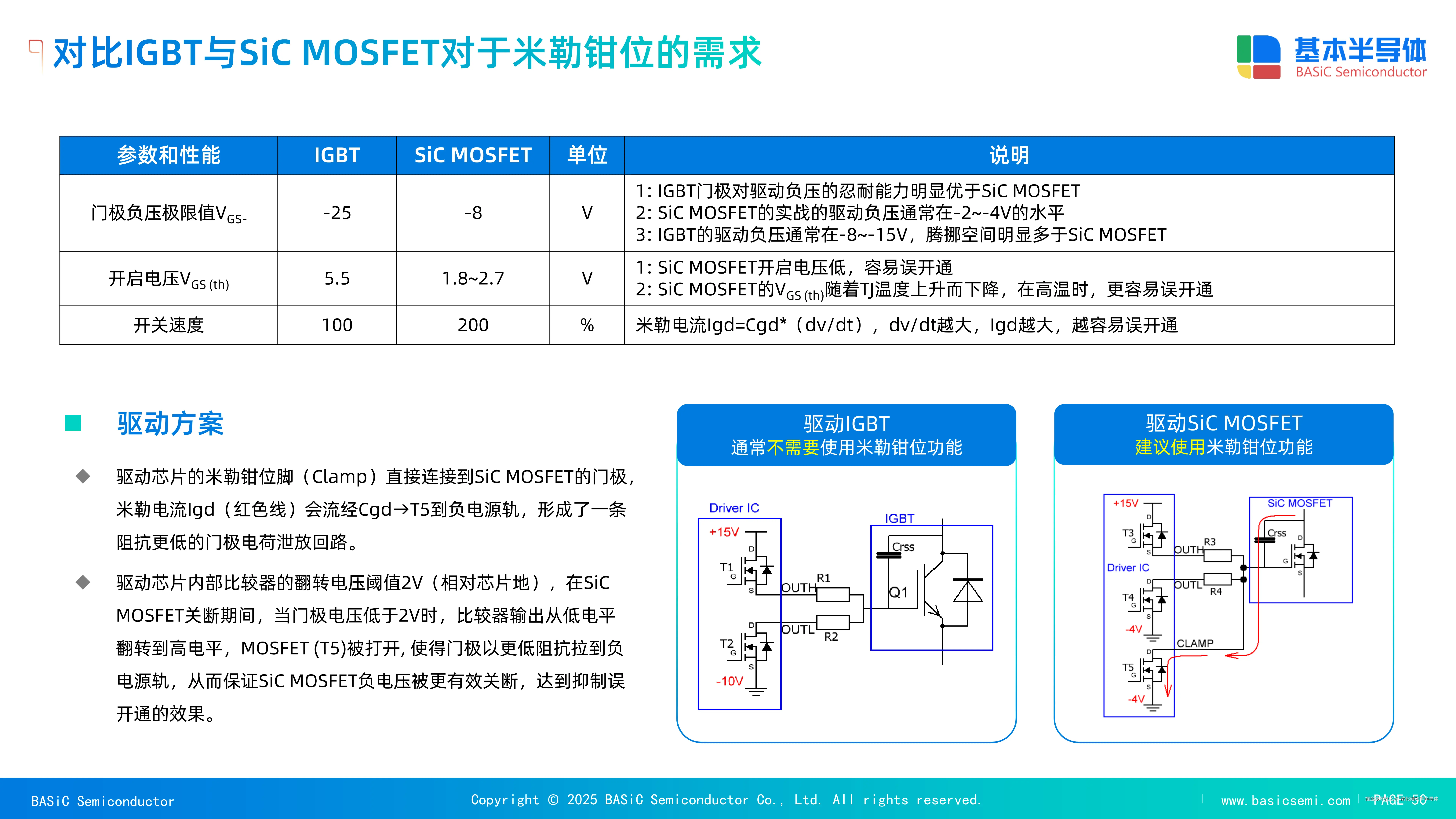 尽管SiC技术优势显著,但其高频特性也对系统设计带来了新的挑战,其中最突出的便是栅极驱动设计和热管理。SiC MOSFET具有比Si器件更低的开启电压(VGS(th)),这使其对栅极驱动的噪声更为敏感,容易发生误导通 。同时,其极高的开关速度(高 dV/dt)会引发严重的米勒效应 。在半桥电路中,当一个开关管导通时,桥臂中点电压的快速变化会通过寄生电容在对管的栅极产生米勒电流,可能抬高对管的栅极电压超过其阈值电压,导致上下管直通并损坏器件 。解决这一问题的方案包括使用负偏置电压(如-4V),减小栅极电阻,并采用带米勒钳位(Miller Clamp)功能的隔离驱动芯片 。米勒钳位通过在关断期间为栅极提供一个低阻抗通路,快速泄放米勒电流,从而有效抑制误导通风险 。此外,尽管SiC的热导率优于Si,但高功率密度仍然对散热系统提出了挑战 。传统的风冷或液冷方式可能不足以满足需求,因此,先进的散热技术(如模块内部的微通道集成)正在被研究,以进一步降低热阻,充分释放SiC的潜能 。