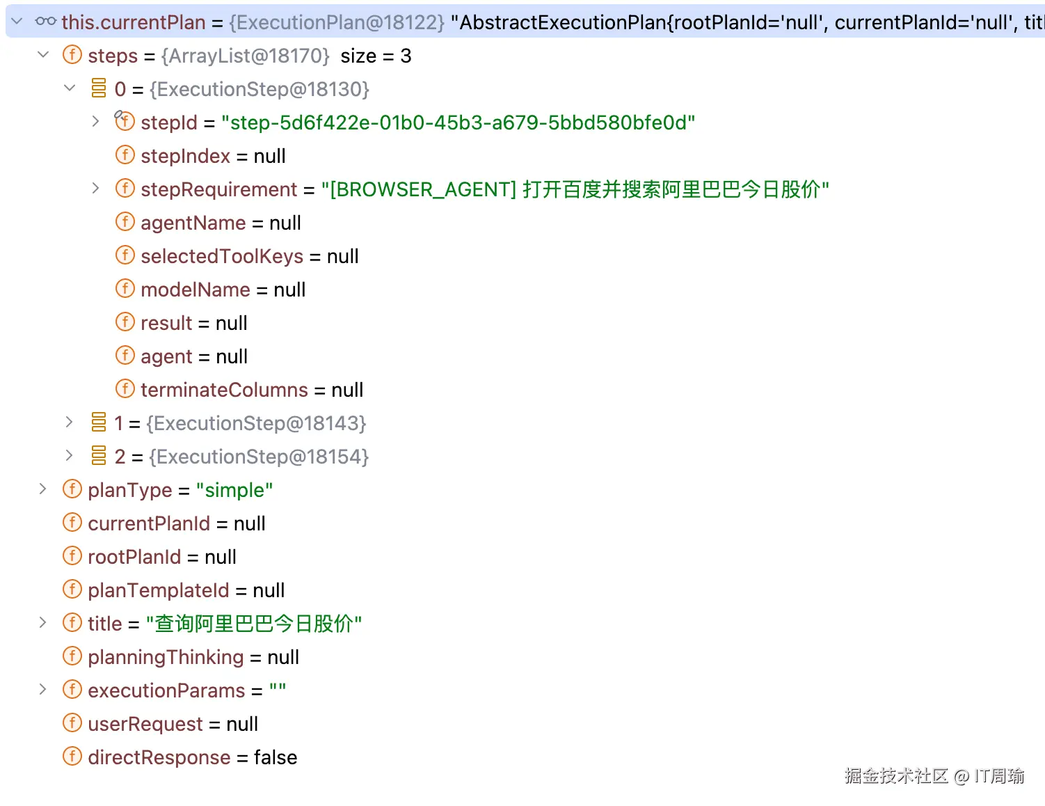 在执行每个步骤时,JManus会先找出当前步骤对应的Agent对象,然后将当前步骤对应的子需求发送给Agent,比如对于“利用BROWSER_AGENT打开百度搜索阿里巴巴今日股价”这一步,会先找到BROWSER_AGENT对象,然后将子需求“打开百度搜索阿里巴巴今日股价”发送给它。