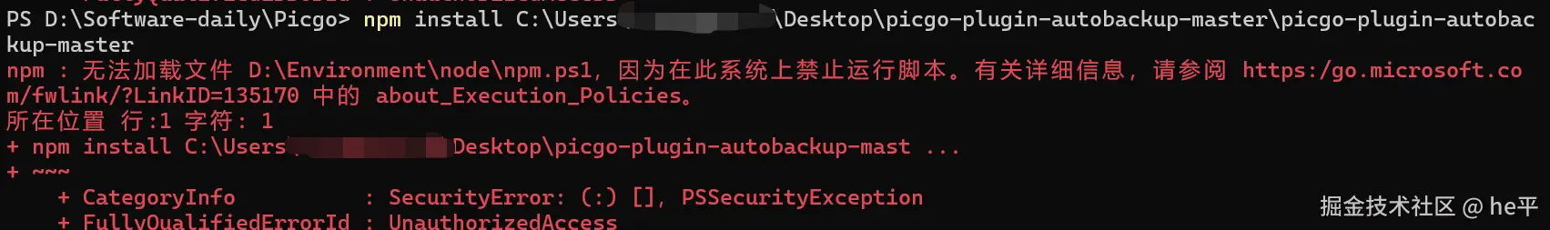 手动安装picgo插件时遇到系统禁止运行脚本的限制 he平 2025-09-28 50 阅读1分钟 手动安装picgo插件时遇到系统禁止运行脚本的限制 问题描述: 安装插件时出现以下错误 原因: 系统限制 解决方法: 暂时解除限制 重新安装即可