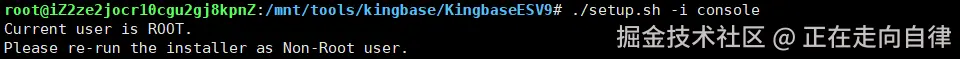 这里又报错了,遇到了一个常见的安装问题:KingbaseES 安装程序要求使用非 root 用户运行。这是出于安全和管理权限的考虑。别担心,这个问题很容易解决。