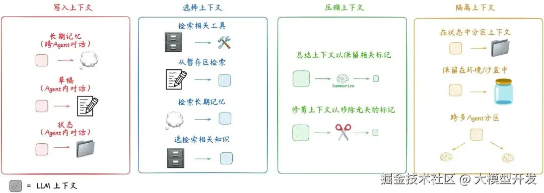 LLM上下文窗口有限,一次只能看一定长度的文本(比如几千到几十万Token),超出就会“遗忘”。有效的上下文工程需要复杂的策略来管理这种有限的资源。这些策略可以分为四大类:写入(Write)、选择(Select)、压缩(Compress)和隔离(Isolate)。