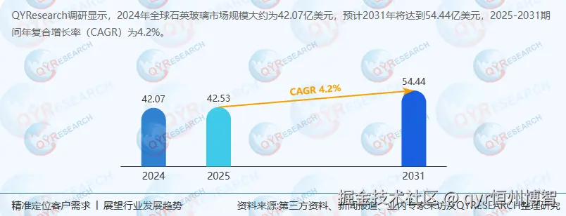 规模:根据QYResearch最新调研报告显示,2024年全球石英玻璃市场销售额42.07亿美元,预计2031年达54.44亿美元,2025-2031年CAGR 4.2%;