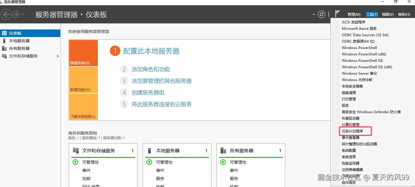 点击服务器管理器的面板右上方的"工具",找到 "任务计划程序",进入到任务计划配置页面