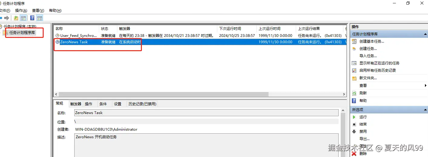 在任务计划程序库中,可以查看已经添加好的ZeroNews启动计划任务