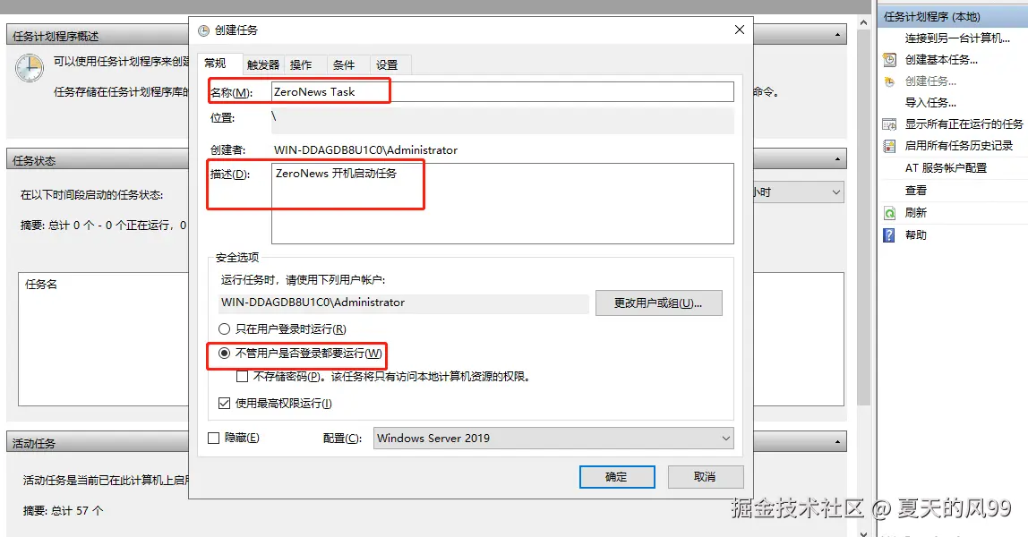 在windows server 系列系统中,ZeroNews 的开机自动默认需要用户登录操作系统之后,才能自动启动,利用系统的计划任务,可以实现用户不用登录的情况下,实现开机自动启动ZeroNews