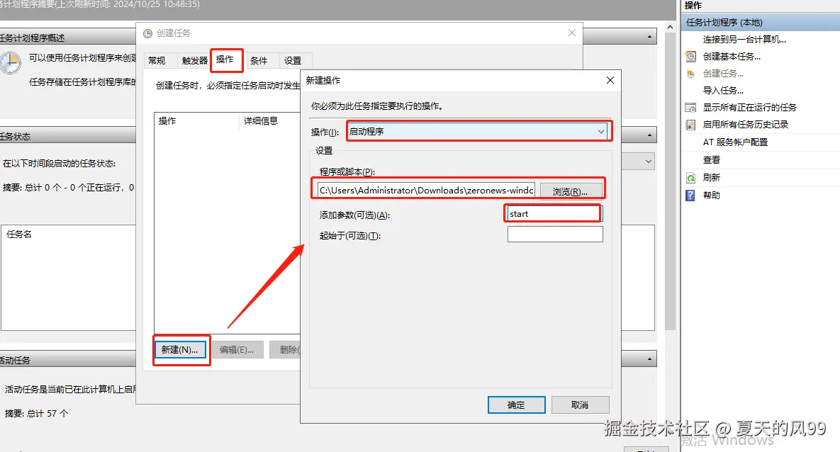 在新建操作的窗口中,"操作" 选择 "启动程序", "程序与脚本" 点击 "浏览",选择 ZeroNews程序所在的文件目录,在 "添加参数"的输入框中,输入 "start", 然后点击确定完成创建