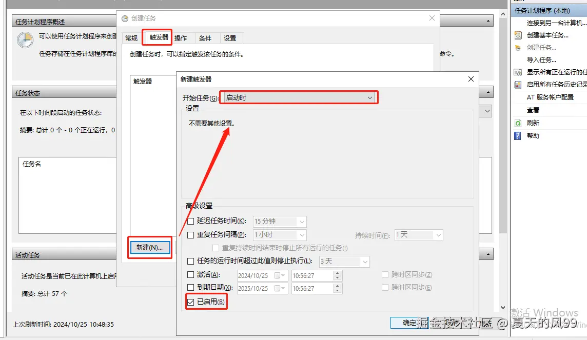 在创建任务窗口的 "触发器" 界面中,点击"新建",新建一个启动的触发器