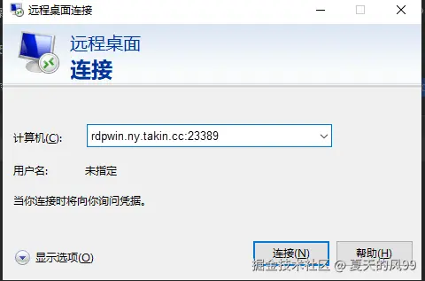 2. 在计算机名称输入框中输入为远程桌面映射的公网域名端口地址 rdpwin.ny.takin.cc:13389, 进行远程桌面连接。