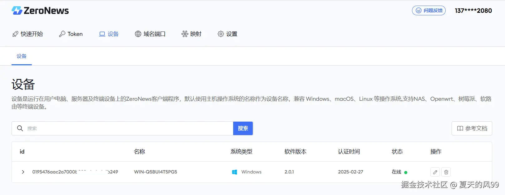 ZeroNews 启动后,您可以在 ZeroNews 平台上查看设备状态,确认其已成功上线。