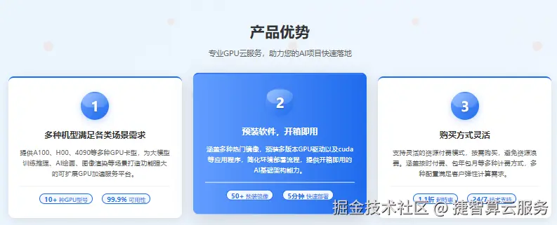 行业趋势表明,4090 云服务器租赁正朝着 “性能虚拟化、配置弹性化、服务场景化” 方向演进。性能虚拟化通过优化 Hypervisor 层实现算力损耗控制在 5% 以内,保障 4090 性能接近物理机水平;配置弹性化支持显卡、CPU、内存等资源的实时调整,满足动态负载需求;服务场景化则针对不同领域预装软件与优化参数,降低使用门槛。捷智算作为深耕算力服务领域的专业平台,精准把握这一趋势,构建了行业领先的 4090 云服务器租赁体系,让高性能算力实现灵活交付。捷智算的 4090 云服务器采用自研轻量化虚拟化技术,将性能损耗控制在 3% 以内,配合英特尔至强金牌 CPU 与 DDR5 内存,形成 “算力 - 带宽 - 存储” 全链路性能支撑,同时支持单卡至 8 卡集群的弹性配置。