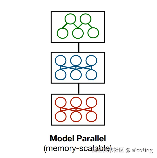 当模型太大无法放入单块GPU时,模型并行将模型本身切分到不同GPU,模型并行包括: