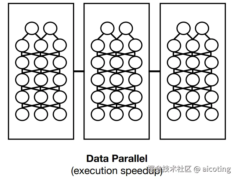 数据并行是最直观的并行策略,其将训练数据按批次拆分,每块GPU处理不同的数据子集。每个GPU拥有完整的模型副本,计算梯度后通过AllReduce或其他通信方式同步参数更新。