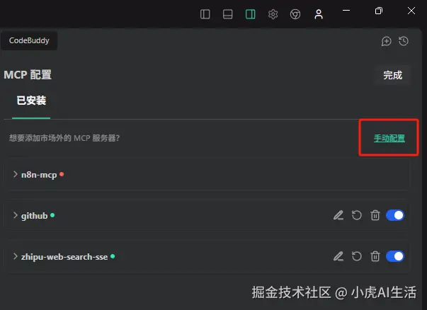 - 在 MCP 配置面板看到多了一行 GitHub,并且有一个绿色小点 ✅——这就是 GitHub MCP 已经连接成功的标志。