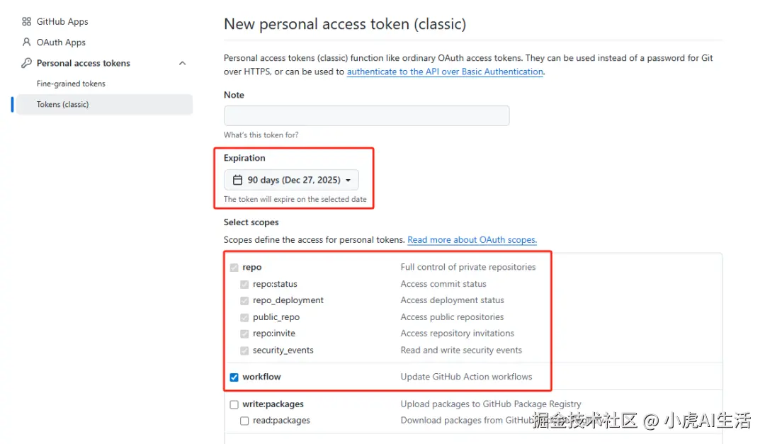 - 点击生成新 Token,过期时间选择90天(不建议永久),权限勾选