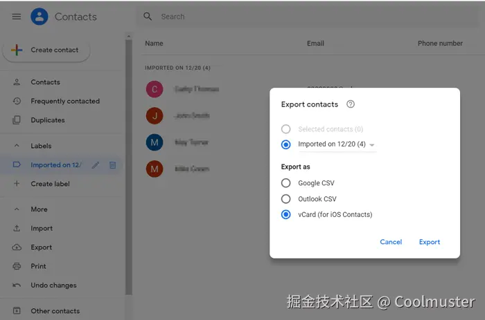 04预览并选择要导出的联系人。点击“导出”,然后选择“CSV”格式将文件保存到您的电脑。