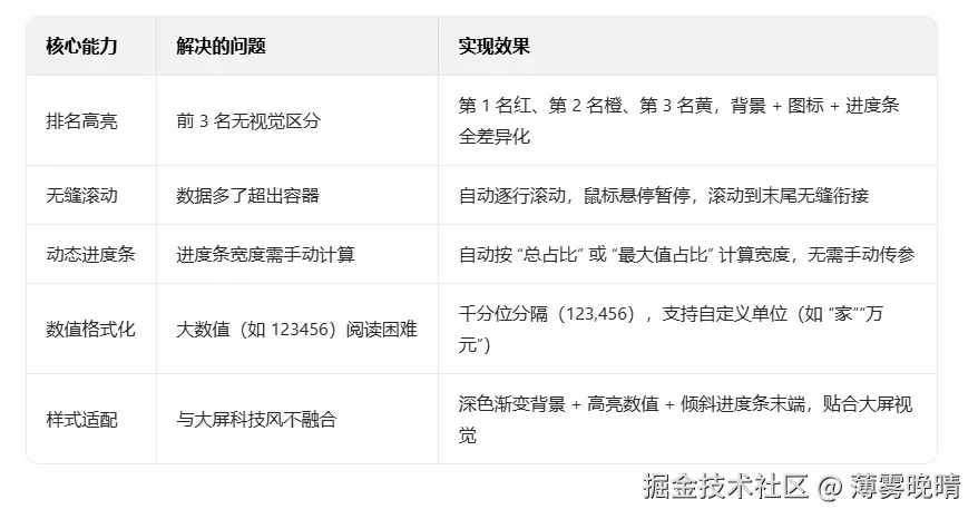 而我们今天封装的组件,就是针对性解决这 3 个问题,让排名数据在大屏上既 “好看” 又 “好用”。