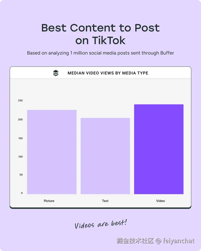 不出所料,在短视频起家的 TikTok 上,视频仍然是获取播放量的最优选择。 尽管平台陆续推出了图文轮播(Carousel)和纯文字帖子,但视频仍是算法的“心头好”。