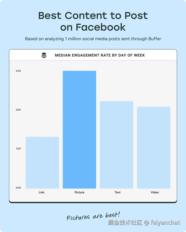 - 图片:互动略高于视频(0.6%),比带链接的帖子高 37%,比纯文字高 60%