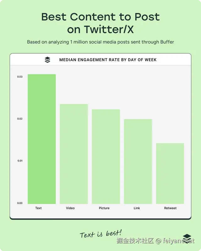 - 文字帖:互动量比视频高 30%,比图片高 37%,比链接帖高 53%
