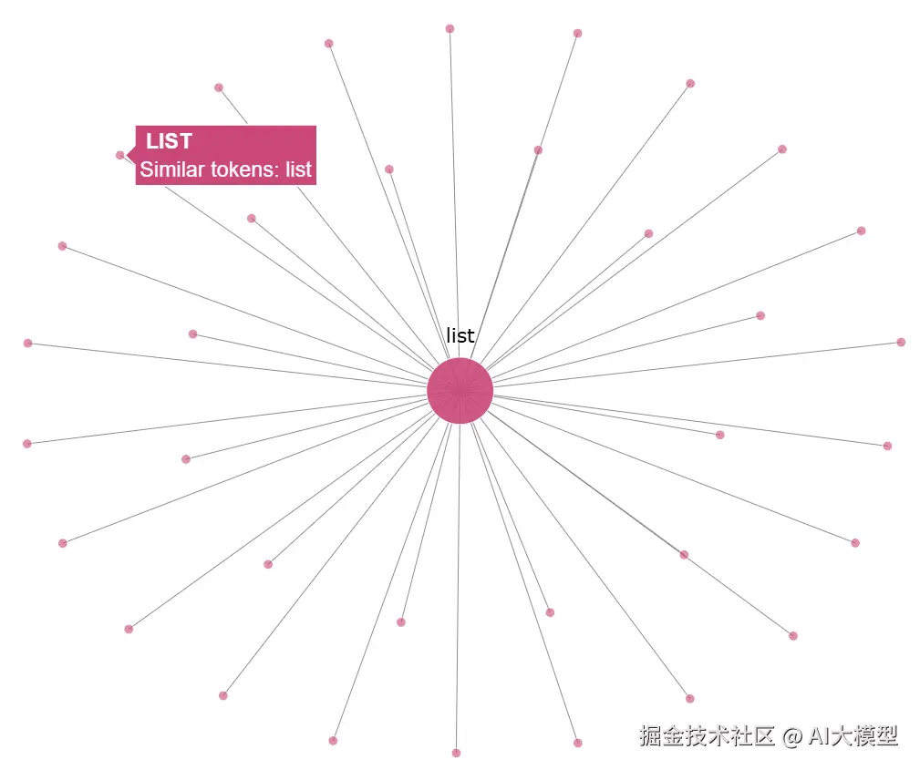 在上述图示例中,我们忽略了“Token变体”。一个标记或单词可能有许多不同的变体,每个变体都有各自的嵌入向量。例如,标记“list”可能有许多不同的变体,每个变体都有各自的嵌入,例如“_list”、“List”等等。这些变体通常具有与原始标记非常相似的嵌入。下图是标记“列表”及其近邻(包括其变体)的图表。