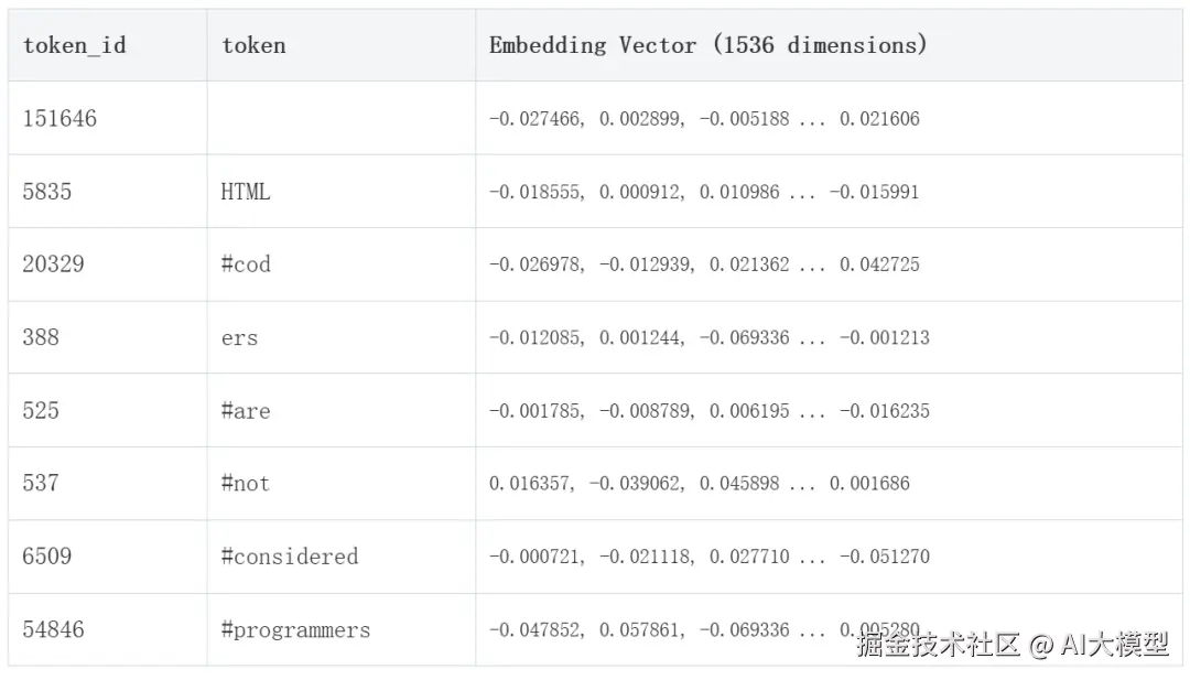 在上面的代码中,我们对句子进行了分词,并打印了分词的嵌入。这些嵌入是 1536 维向量。这里有一个简单的示例,以“HTML coders are not considered programmers”这句话为例。