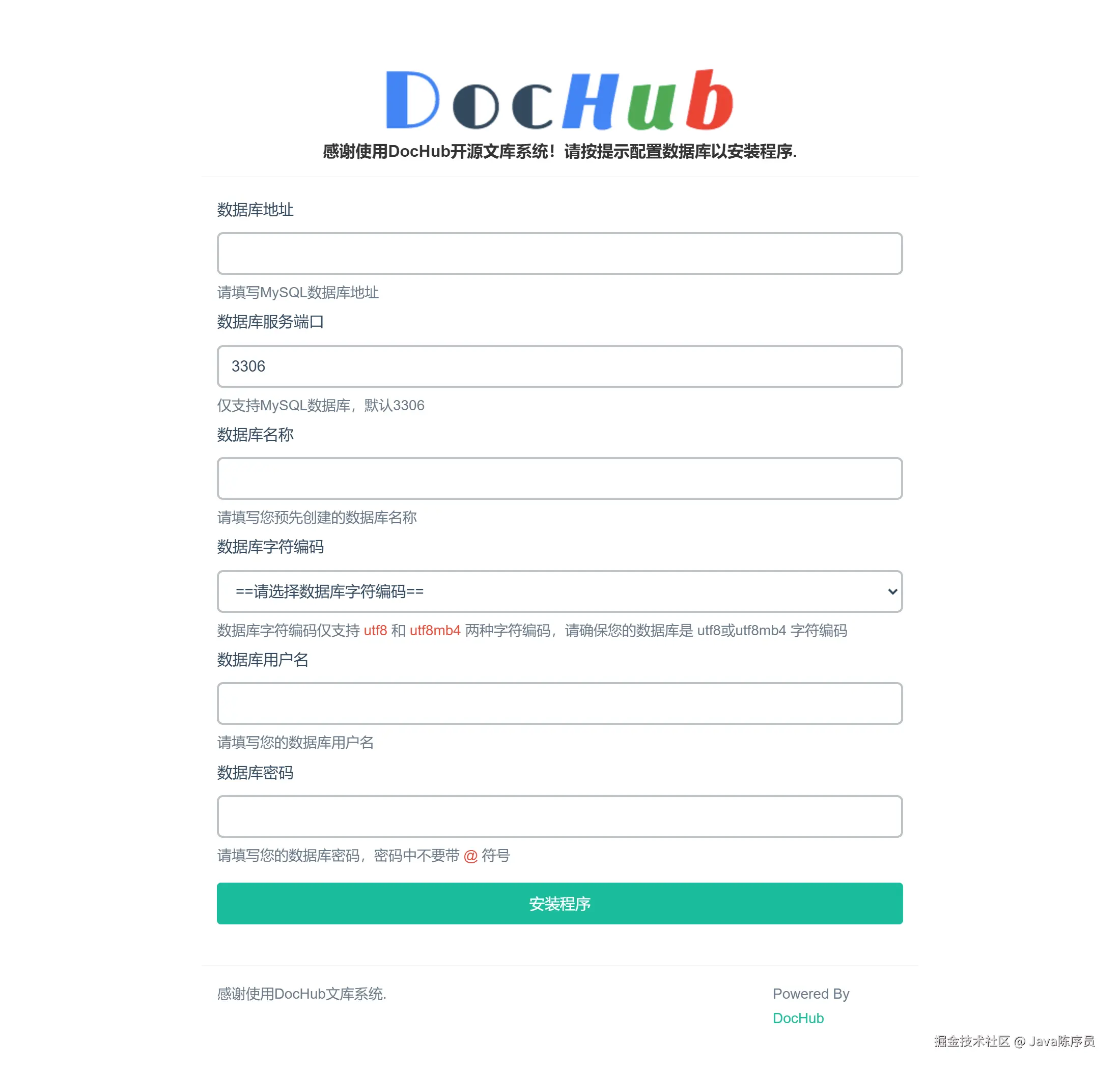 4、首次访问 DocHub 需要进行配置数据库信息进行安装