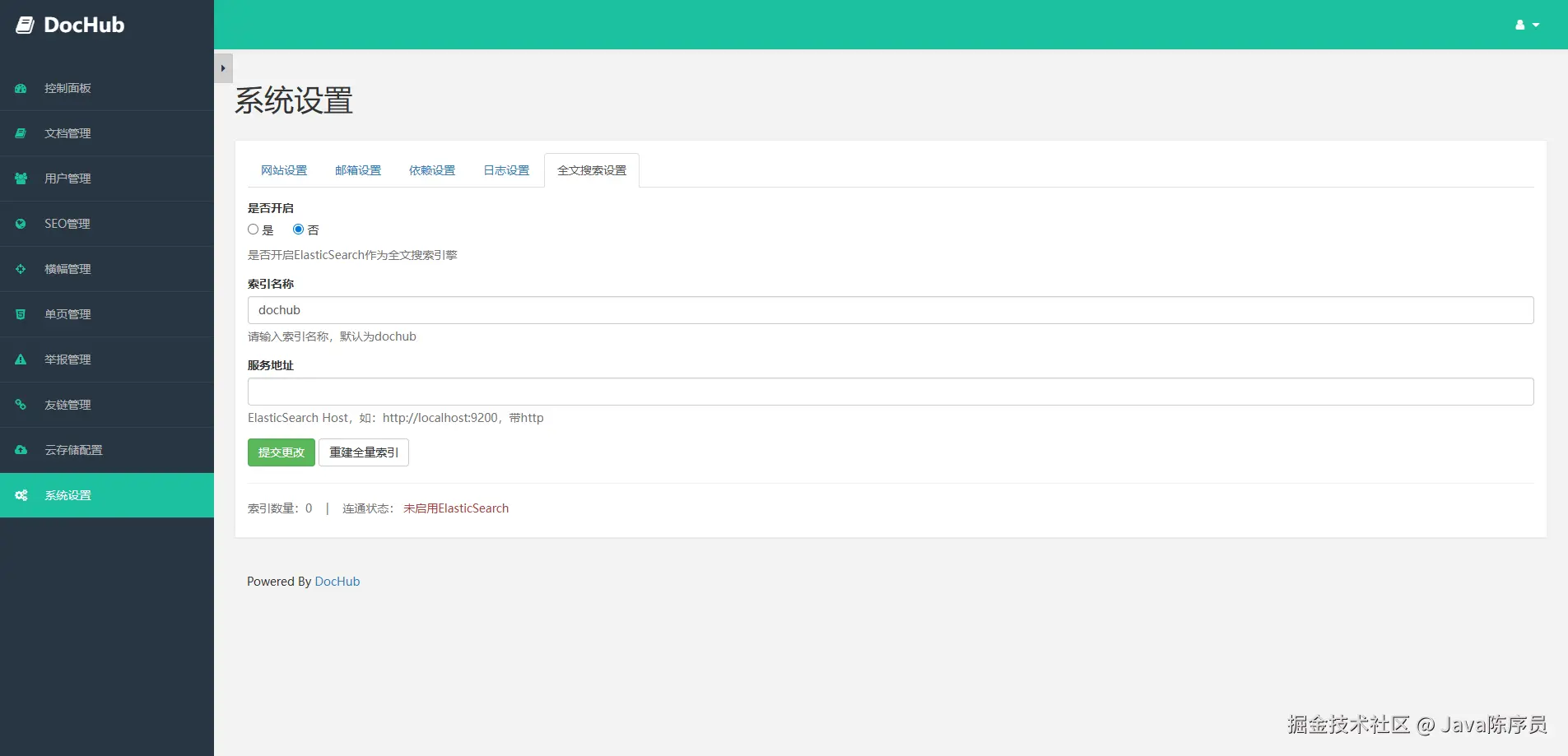 6、进入系统设置,配置网站配置、邮箱设置、依赖设置、日志设置、全文搜索设置等信息