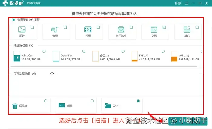 步骤1: 在电脑中打开数据 蛙恢复专家,进入软件的首页后,我们可以选择需要恢复的文件类型 (如图所示,可以作为扫描条件设置的文件类型有图片、文档、电子邮件、音频、视频) ;再选择扫描位置 (可选择内部存储位置和外部存储位置) ,选好后单击【扫描】按钮;