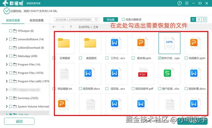 步骤2: 在扫描完成后,根据目标文件的原路径或类型,可以在左侧的目录选择更为详细的分类,缩小文件的搜索范围。选择好文件后,点击【导出】按钮,进入下一步;