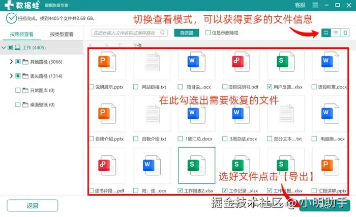 步骤2: 通过软件扫描出来的文件会显示在指定位置,我们可以在左上方的三个方格选择想要的文件查看模式;在里面点击需要恢复的文件后,再点击【导出】;