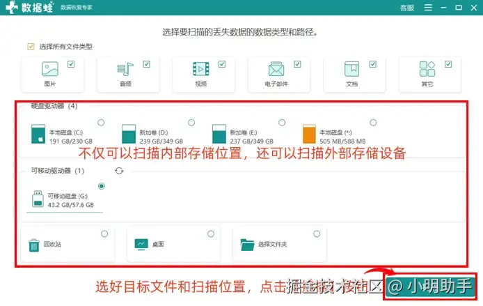 步骤1: 在电脑顺利完成该软件的下载安装后,我们可以在软件的首页即扫描准备界面中根据自己的实际需求完成文件类型和扫描位置的设置;